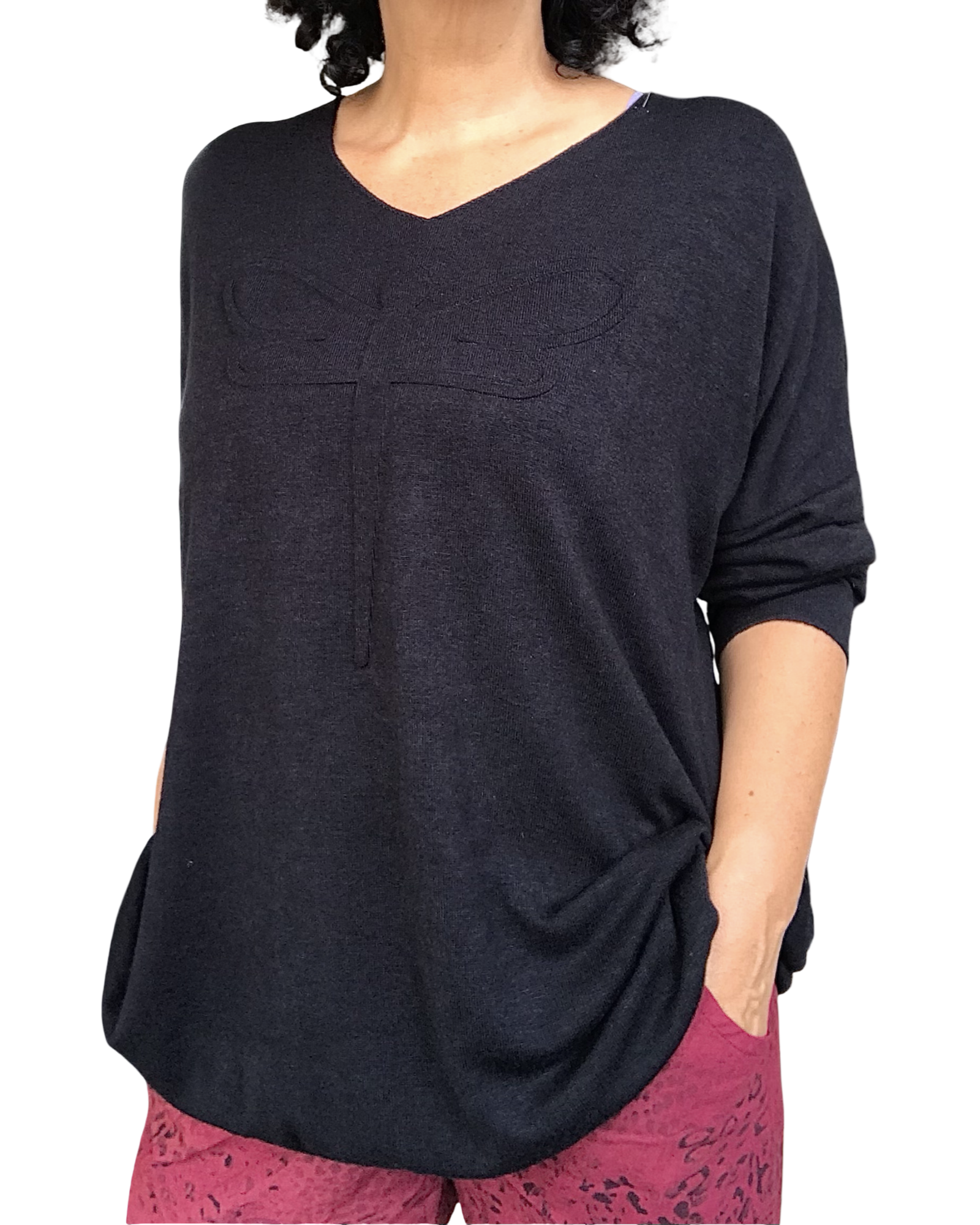 Chandail uni noir col en V avec libellule embossée – Description du produit