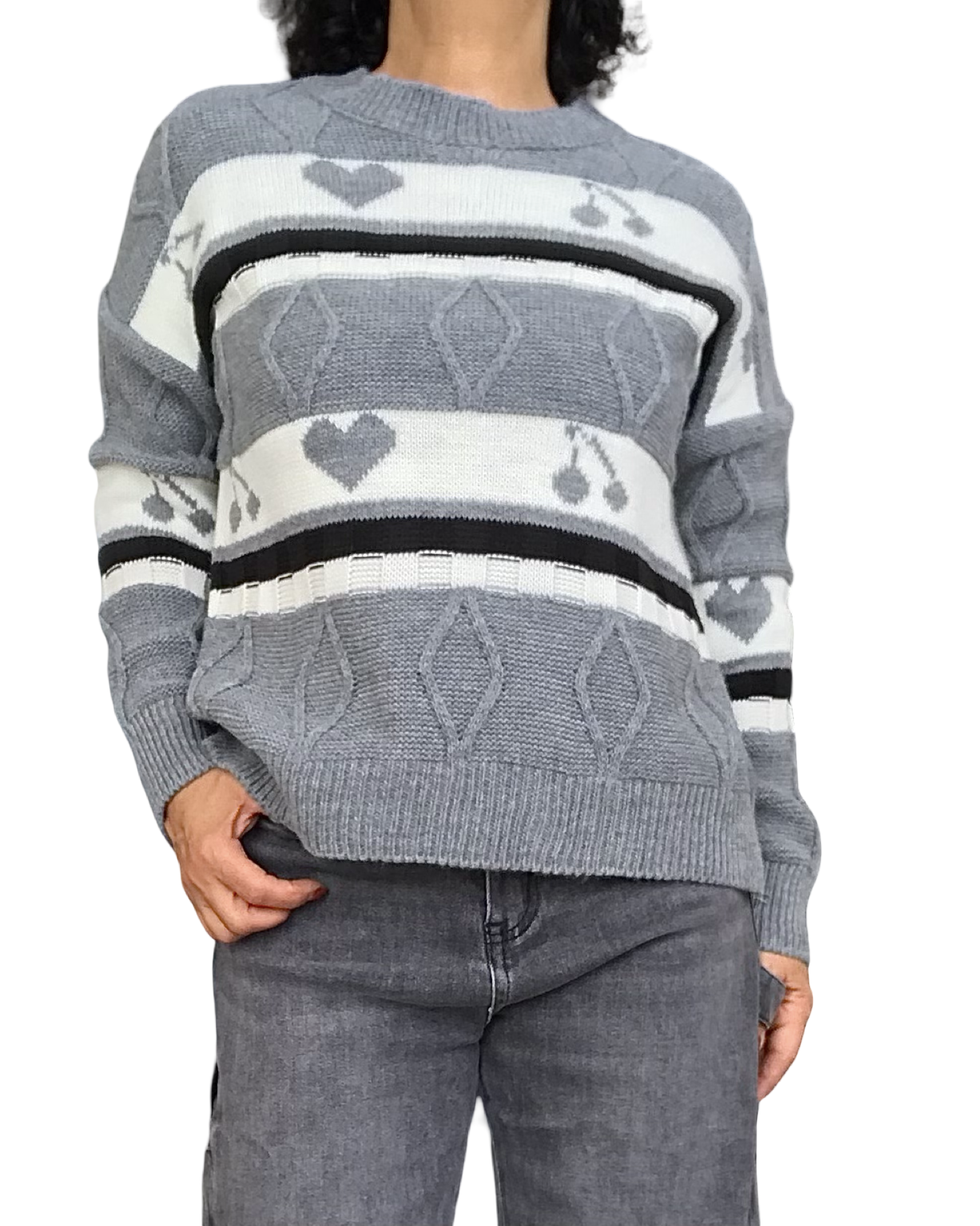 Chandail en tricot gris col rond avec cœur et cerise – Description du produit