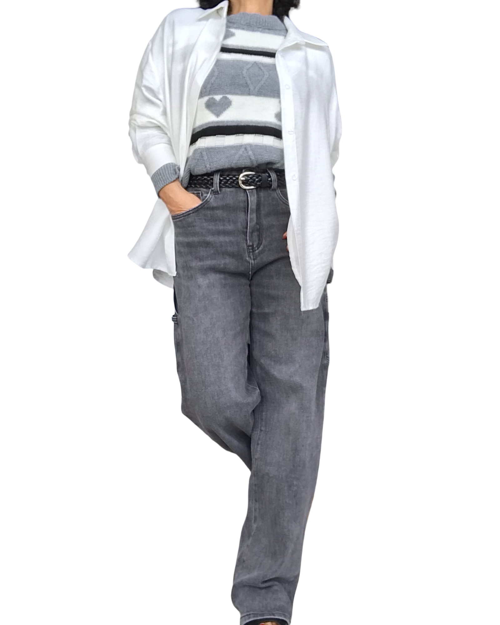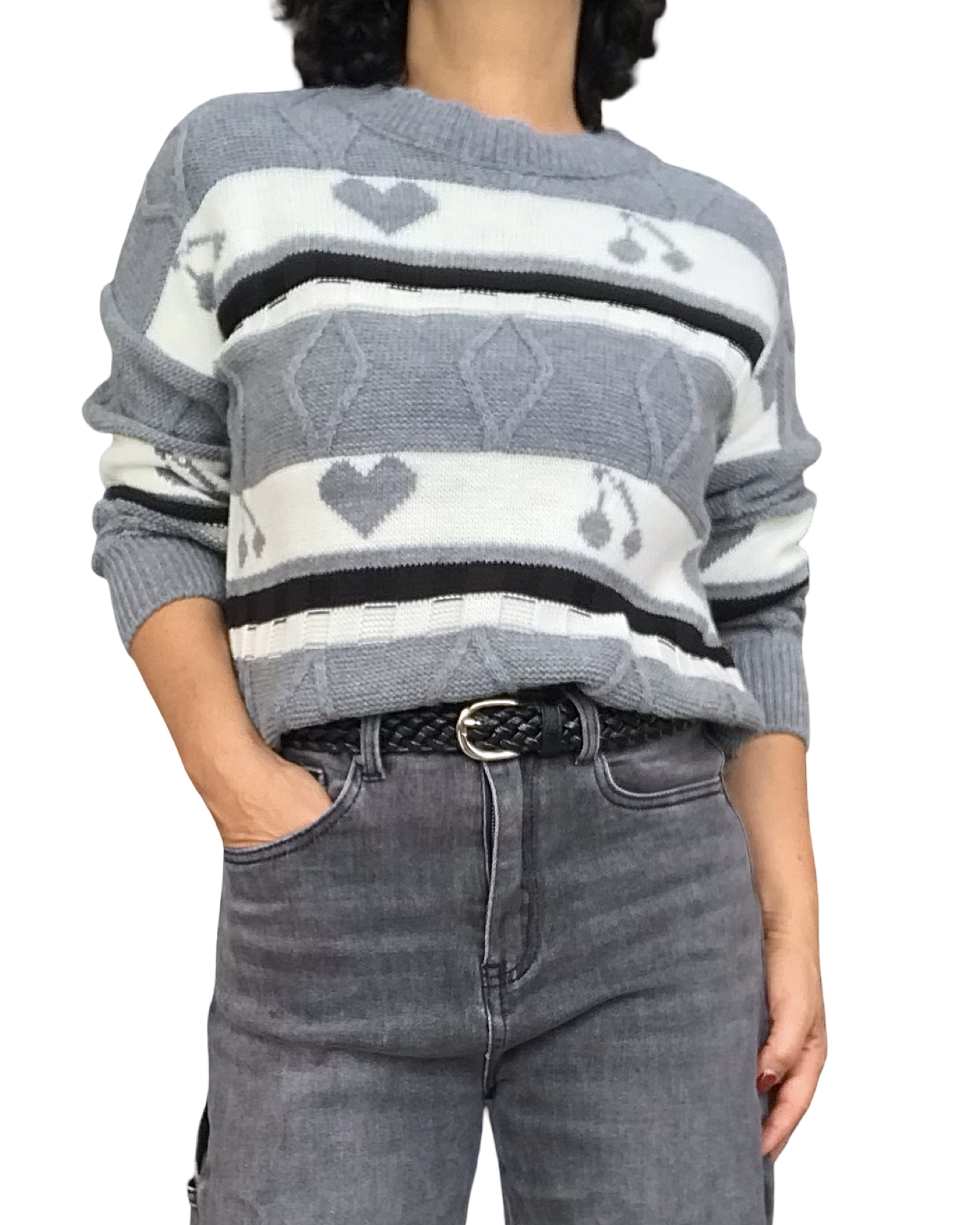 Adoptez un style à la fois doux et ludique 🌸🍒. Ce chandail gris à col rond séduit par ses motifs cœur et cerise en relief, ses rayures crème et noir, et ses finitions élégantes à l’encolure, aux manches et au bas. Léger et confortable, il apporte une touche raffinée à vos tenues décontractées.