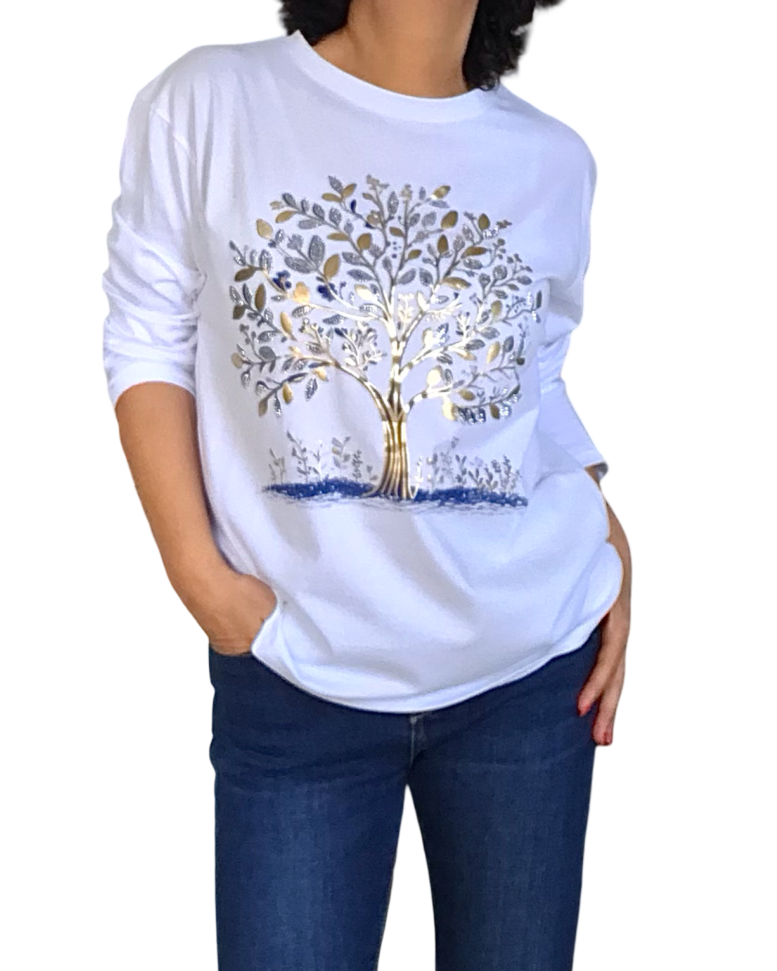 T-shirt manche longue blanc avec l’arbre de vie dorée et marine