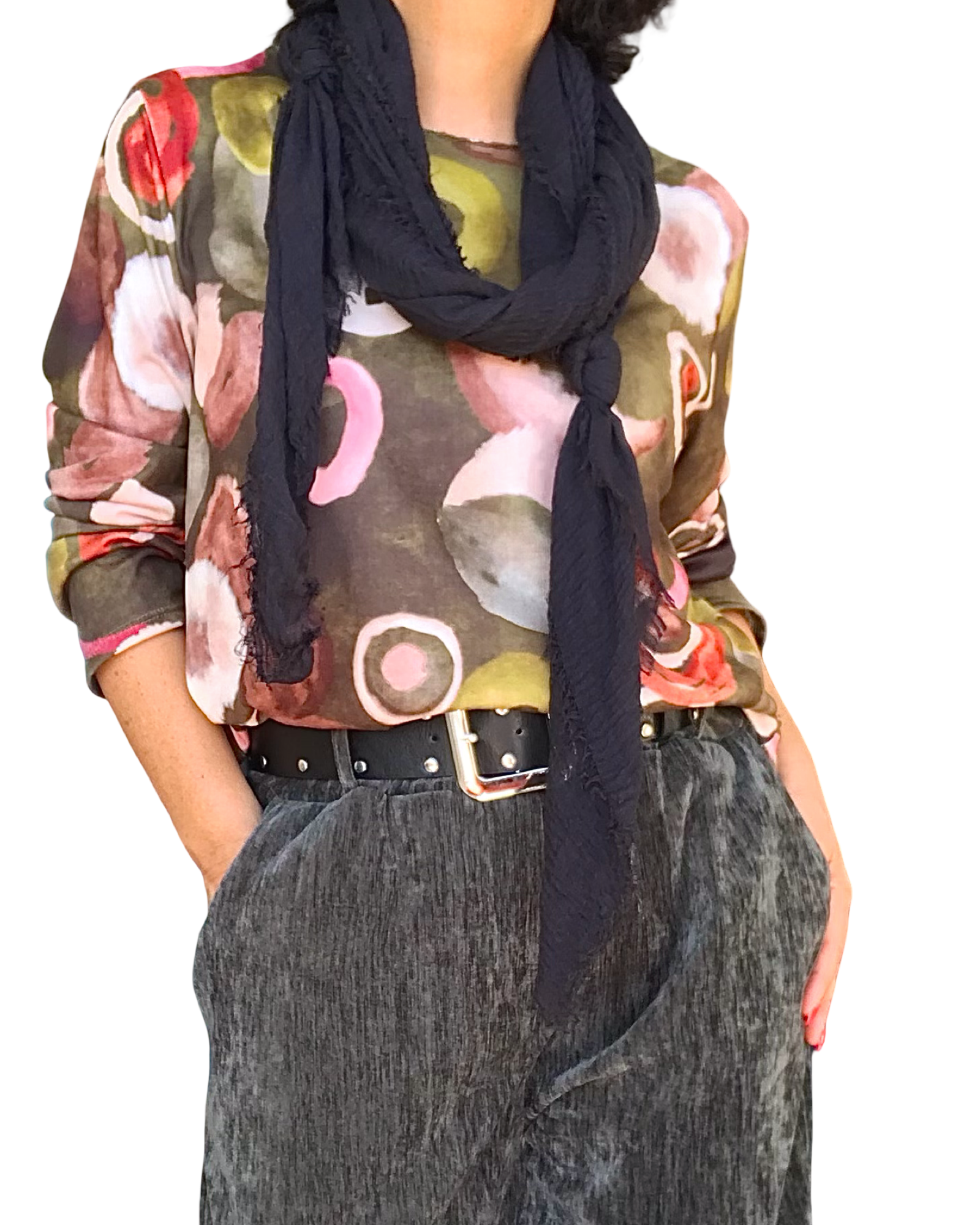 Un t-shirt élégant et moderne 🌟. Sa base kaki est sublimée par un imprimé de cercles rouille, crème, brun et blanc 🎨. Conçu en viscose douce et extensible, il assure confort et style, parfait pour une allure raffinée et décontractée au quotidien.