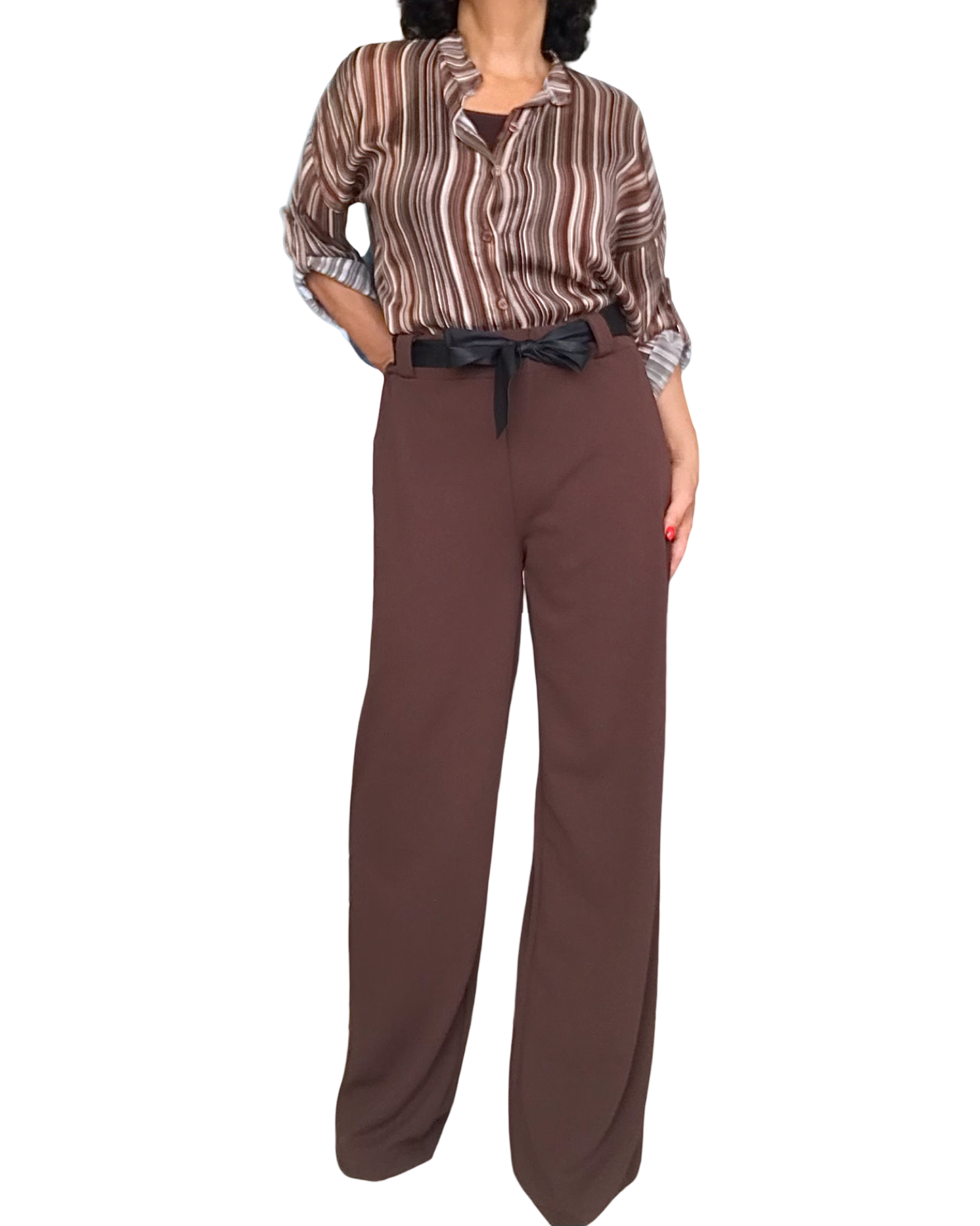 Découvrez le pantalon droit brun, un essentiel chic et confortable 🌟. Sa taille élastique avec ruban noir en guise de ceinture s’ajuste parfaitement à votre silhouette. Léger, agréable à porter et extensible, il offre une liberté de mouvement idéale. Avec sa coupe droite et ses 31 pouces de longueur, il se porte facilement au quotidien.