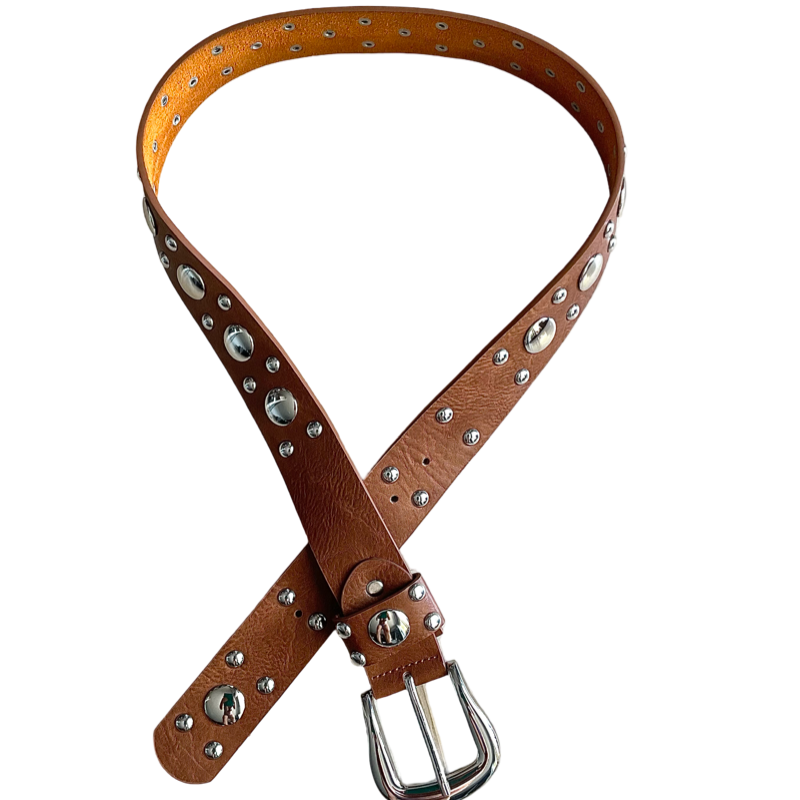 Découvrez notre ceinture cognac en similicuir , alliant élégance et confort. Dotée d'une boucle et de clous argentées, cette ceinture donne un style contemporain. Elle habille les silhouettes 1-2-3 et elle mesure 1 1/2 pouces de largeur.