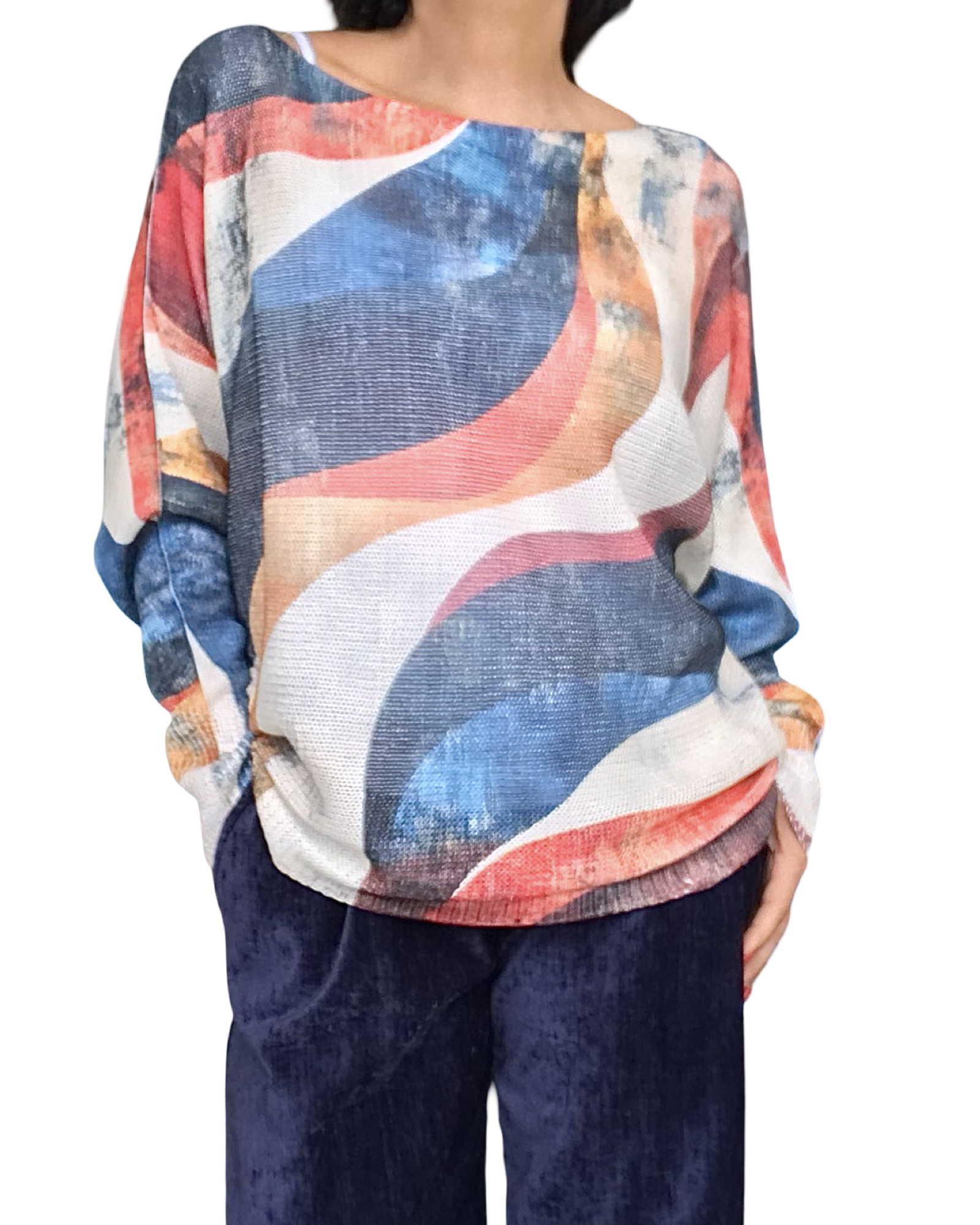 Égayez votre garde-robe avec ce chandail imprimé géométrique coloré, à manches chauve-souris et col rond évasé. Son tricot léger et confortable, aux teintes vibrantes (marine, orange, brûlé, camel, rouge, vin et bleu jeans), en fait une pièce originale et élégante à porter au quotidien.